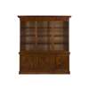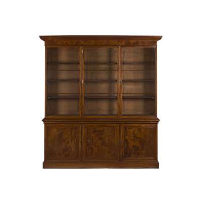 the moulded cornice above a three glazed doors opening to shelves; the lower part with three moulded panel doors, raised on a moulded plinth base