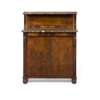 the superstructure with a pierced brass gallery, the upper tier on gilt metal foliate cast supports, above a marble top over a pair of cupboard doors flanked by reeded and acanthus carved pilasters, raised on turned round feet