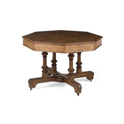the octagonal top with a moulded edge with ebony banding, above a deep frieze with two opposing drawers, raised on ring turned and bead moulded column supports and cruciform base with porcelain castors
