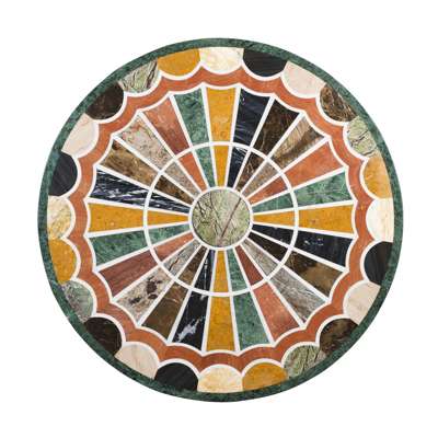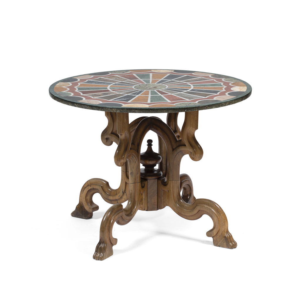the circular top inlaid with radiating fan veneers of various hardstones and marbles, on a Gothic style scroll and arched quadriform base centred by an urn finial and ending on carved paw feet, stamped 'Strahan & Co'