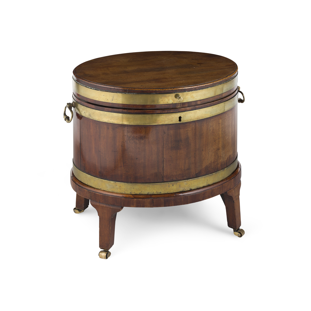 GEORGE III MAHOGANY BRASS BANDED WINE COOLER ON STAND