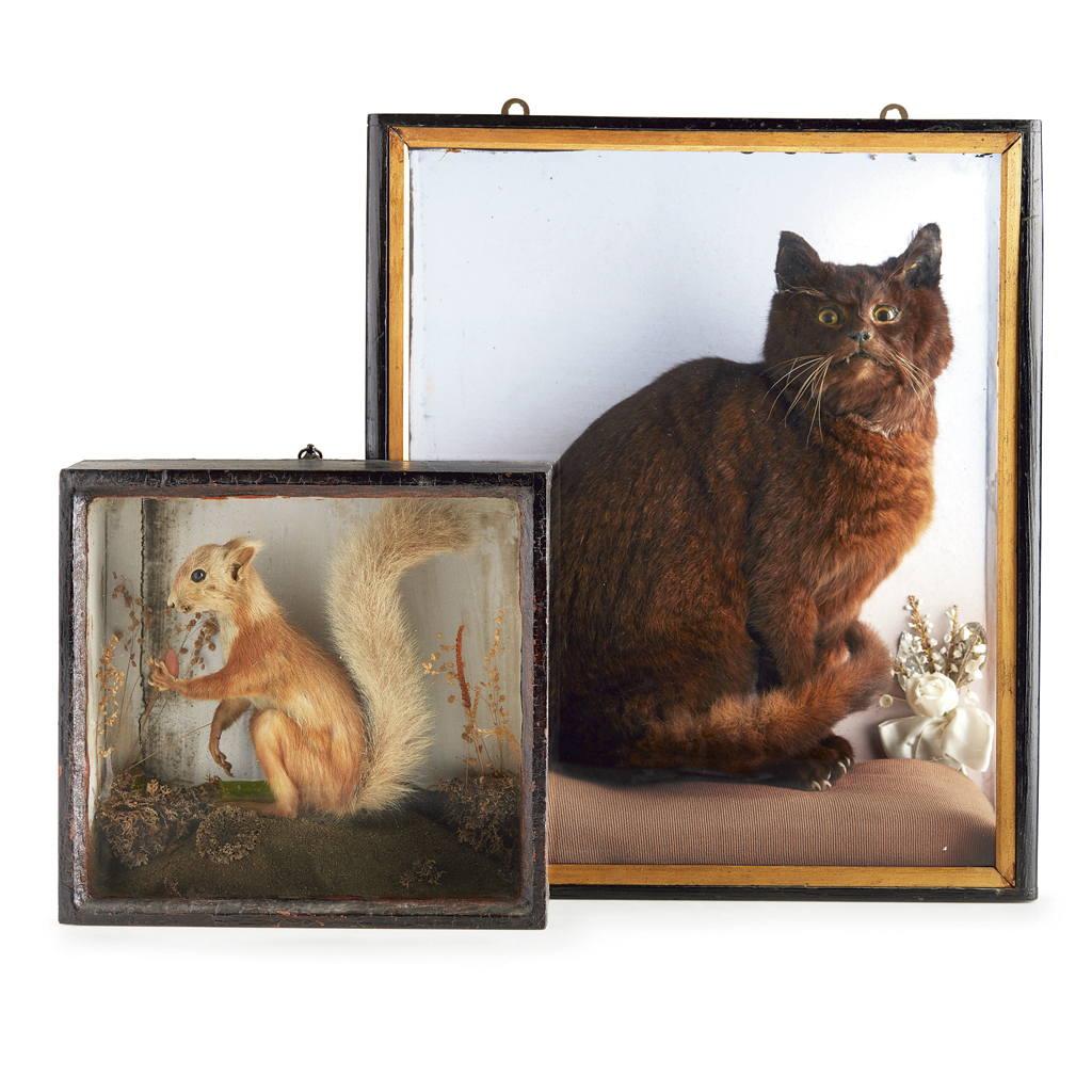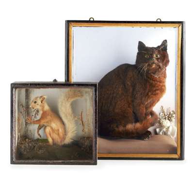 the seated black cat a full mount with glass eyes, in a painted glazed case, overall 42cm wide, 50cm high, 22.5cm deep; the red squirrel a full mount with glass eyes, in a naturalistic diorama and painted glazed case, overall 30cm wide, 28cm high, 11.5cm deep (2)
