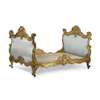 the upholstered head and footboards in pale blue silk, in a gilt frame with exuberant C scrolls, acanthus, flower heads, and rocaille, the side rails centred by vacant cartouches, raised on short scroll legs ending in scroll toes, inscribed 'P Noel / Gilder 1845'