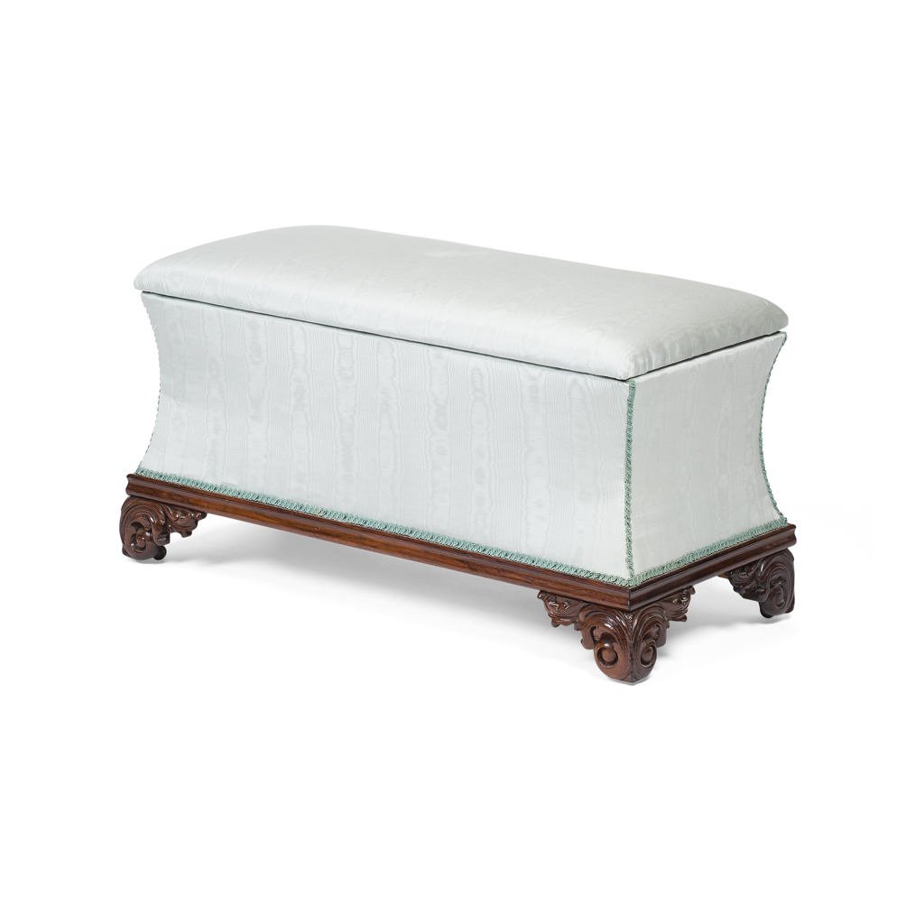 the hinged padded seat cover opening to a void interior, above concave sides raised on acanthus carved scroll feet, in pale blue silk upholstery