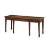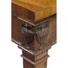 the rectangular top above a moulded frieze centred with a panel carved with an urn and foliate scrolls and flower heads, above a band of ribbon carved moulding, raised on square tapered legs headed by carved urn capitals and ending in roundel carved moulded feet; bearing an ivorine Frank Partridge trade label