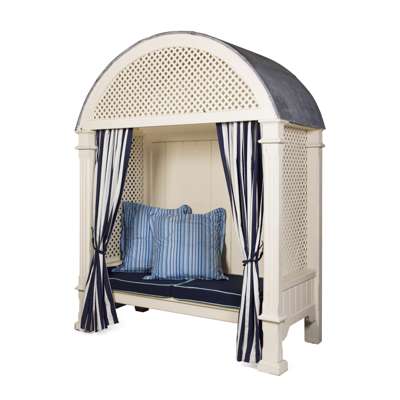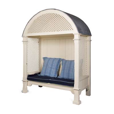 the arched lead covered roof above a lattice frieze and side panels, with an enclosed panel back and seat fitted with loose cushions in blue upholstery. raised on fluted square columns; with a pair of blue and cream striped curtains and blue striped throw cushions
