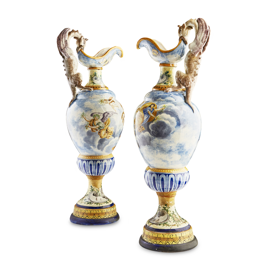 PAIR OF LARGE CONTINENTAL MAIOLICA EWERS