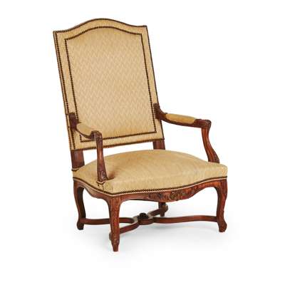 in the Louis XIV style, the high arched back and padded open arms above a stuff over seat and shell and acanthus carved seat rail, raised on cabriole legs joined by a wavy X form stretcher