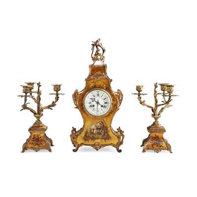 comprising a clock with twin train movement and enamelled dial within a waisted case with applied mounts and painted decoration depicting flowers and figures, the movement striking on a gong, stamped A1; and a pair of attendant candelabra, with three outscrolling arms (3)
