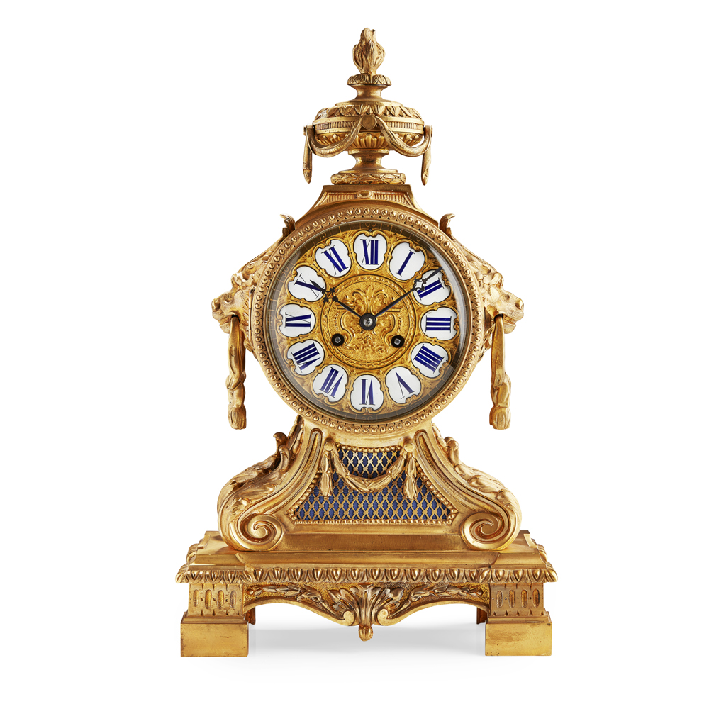 the circular enamel cartouche dial in a cylinder case surmounted by a flaming urn and flanked by lion mask loop handles, raised on foliate scrolls and a pierced grille, on a shaped rectangular base raised on square feet, the eight day movement striking a bell