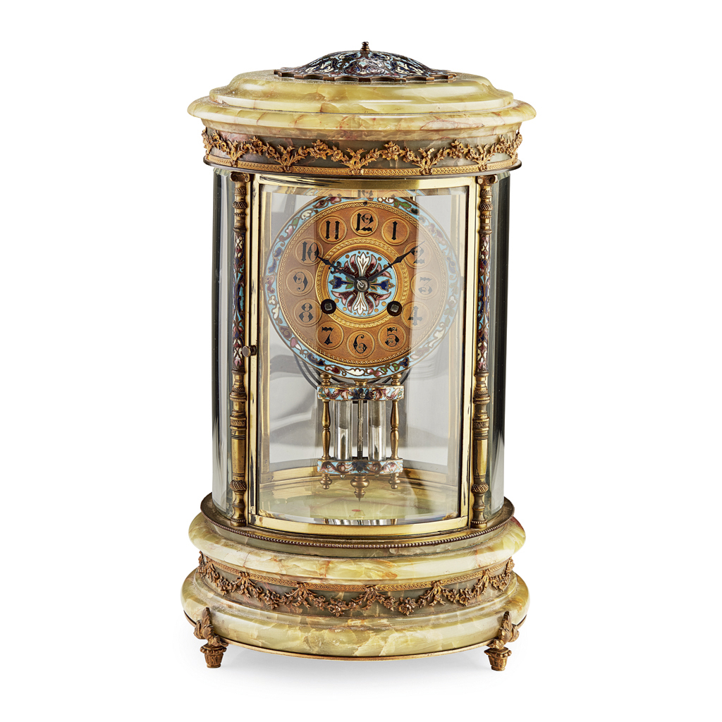 FRENCH CHAMPLEVE ENAMEL AND ONYX MANTEL CLOCK