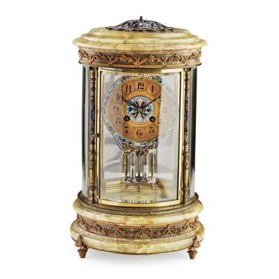 the four glass oval case with an onyx top with a champleve roundel above a gilt dial with Arabic numbers and a mercury filled pendulum, on a conforming onyx base raised on toupie feet, the movement striking on a gong