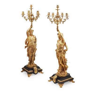 PAIR OF FRENCH GILT BRONZE AND SLATE FIGURAL CANDELABRA, AFTER JEAN LOUIS GREGOIRE