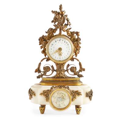 the white enamel dial with Arabic numbers and raised gilt beaded decoration, in a cylinder case surmounted by a flower filled vase and floral garlands, on a shaped oval white marble base with gilt metal mounts and a central roundel, on gilt metal tapered feet