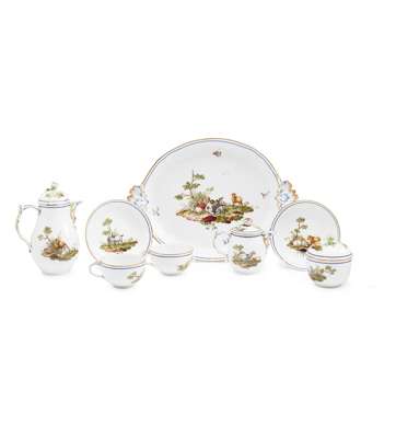 painted with farm animals in a landscape, within gilt and blue-painted bands; comprising a coffee pot and cover, 14.5cm high; a milk jug and cover, 9.5cm high; a sugar bowl and cover, 8.5cm high; two cups and two saucers; and a two handled tray, 30cm wide, blue sceptre marks (8)