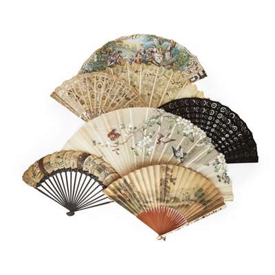 of various size and materials, including lace, net, silk and painted lithographs on paper examples; and further painted gauze examples depicting figures, birds and flowers, with mother-of-pearl and ivory sticks, some contained within boxes (17)