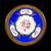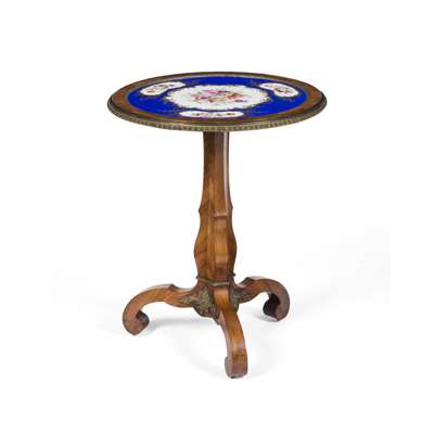 the circular top inset with a Sevres style porcelain panel decorated with flower spray reserves against a blue ground, the edge banded with a gilt metal mount, on a facetted baluster column raised on scroll legs