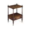 with a rectangular upper tier over a base with a single drawer, on turned legs ending in brass caps and castors