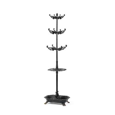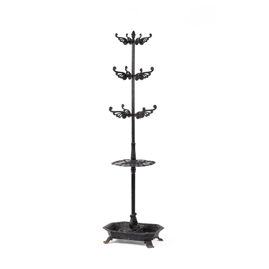 the central column with two tiers of anthemion cast arms, above a rectangular drip pan; together with a collection of walking sticks and canes, of various lengths, the handles in different materials, some with silver knops (qty)