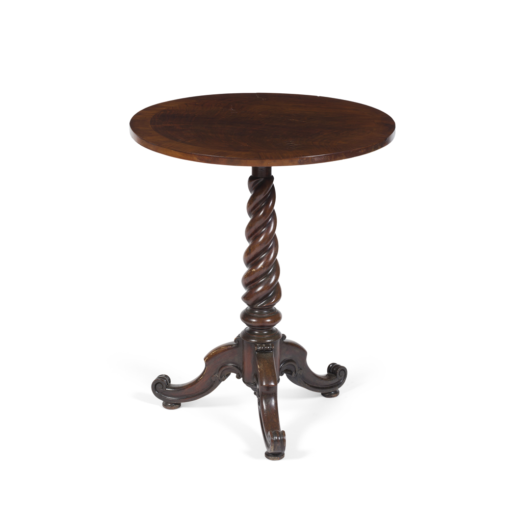 the circular crossbanded top on a spiral carved columns support raised on scroll carved cabriole legs ending in raised scroll toes