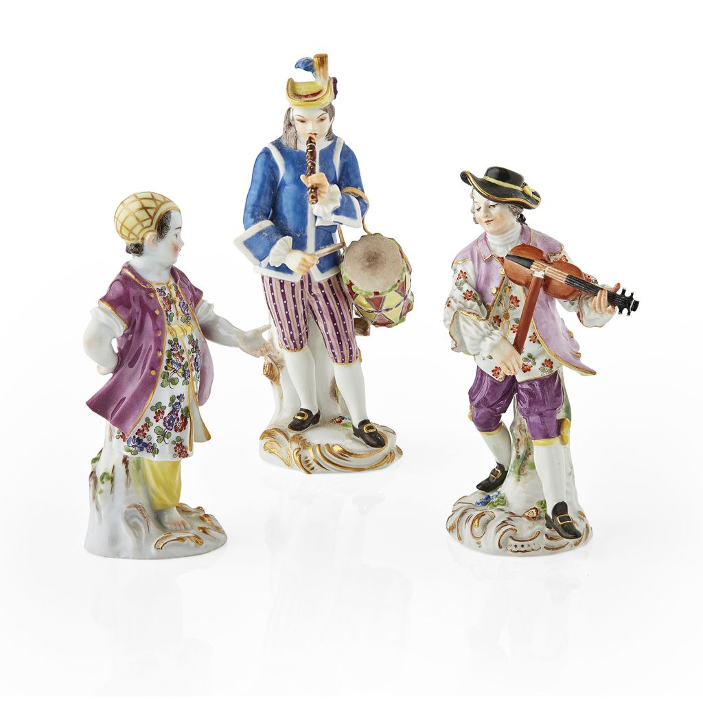 comprising a figure of a young man playing a recorder with a drum over his arm, 15cm high; a figure of a young man playing a fiddle, 13cm high; and the figure of a child in exotic dress, 12cm high; all with underglaze blue crossed swords and incised marks (3)