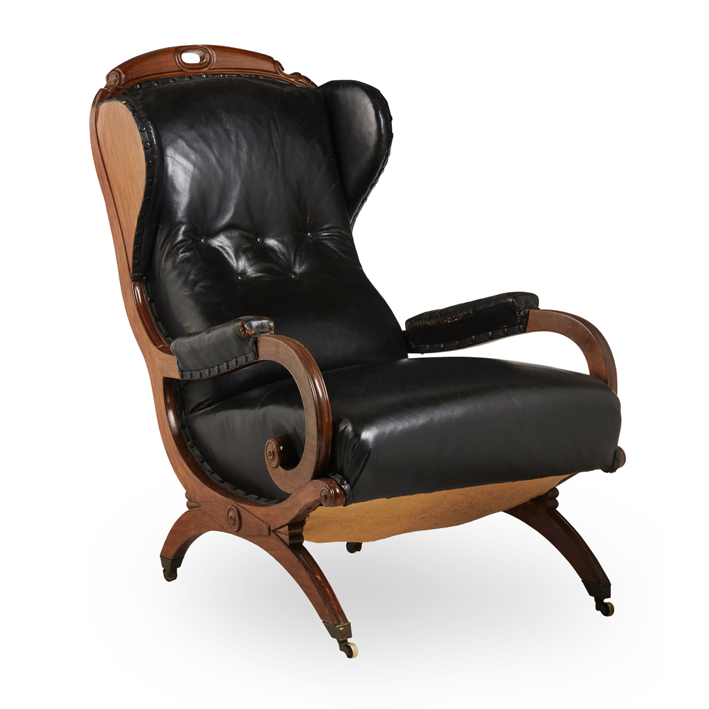 GERMAN MAHOGANY AND LEATHER UPHOLSTERED WING ARMCHAIR, AFTER A DESIGN BY KARL FRIEDRICH SCHINKEL
