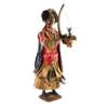 with painted and leather composition body and glass eyes, the nodding head and moving arms with articulated fingers, dressed in silk clothes, beads and gilt metal accessories