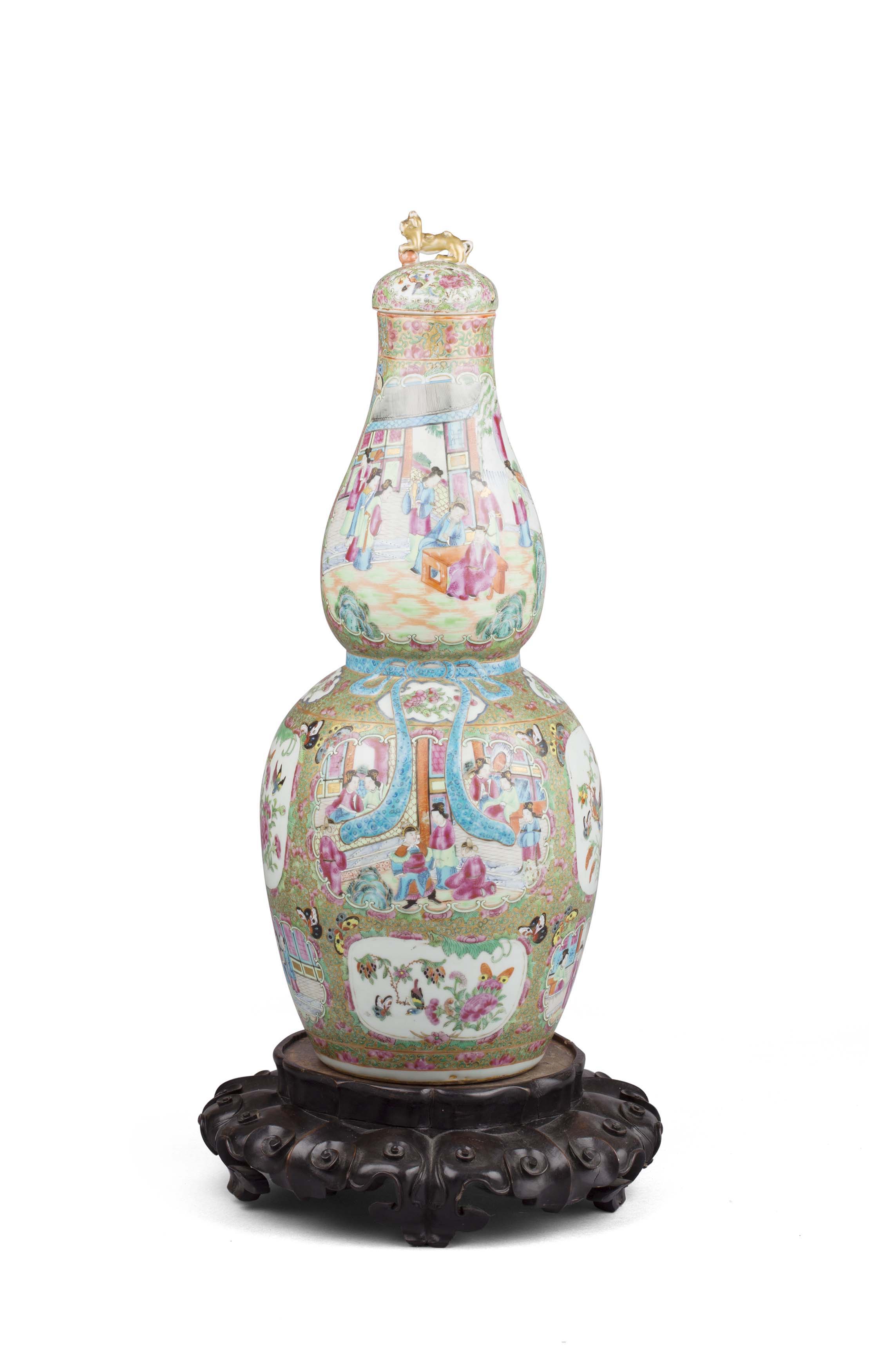of double gourd form, decorated with opposing panels of figures, birds, butterflies and flowers, on a green, pink and gilt ground, with a hardwood stand