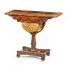 the rounded rectangular top above a long drawer and green silk lined sliding work box, on a facetted column and shaped quadriform base raised on bun feet