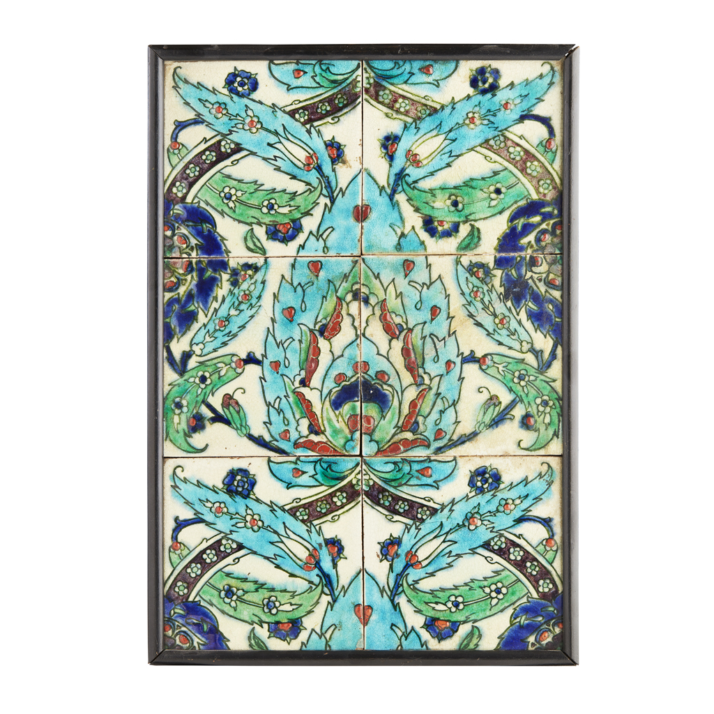 FRAMED IZNIK-STYLE SIX TILE PANEL, ATTRIBUTED TO PILKINGTON'S ROYAL LANCASTRIAN