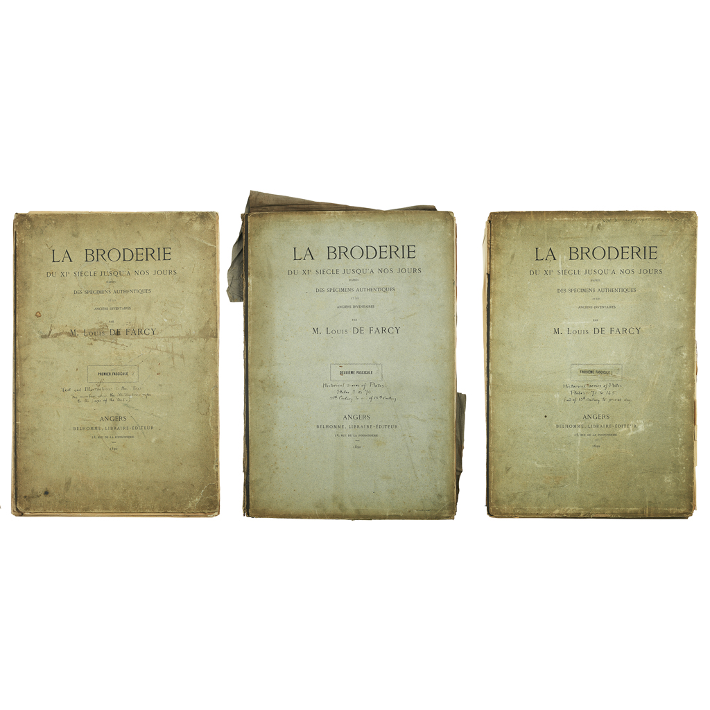 La broderie de XIe siècle jusqu'a nos jours. Angers: Belhomme..., 1890. 3 volumes, elephant folios, 145 plates, original portfolio folders contained inside modern green book boxes, spines weak and detached; Camerino, J.G. Les points de Venise. Paris: Librarire des Arts Décoratifs, [n.d.] Folio, 37 plates (of 40, numbers 21, 24 and 29 lacking), original portfolio folder, ties broken; Prévot, Gabriel, illustrator Stores guipures & broderies d'art rideaux & brises-bise dans le style moderne. Plauen: Christian Stoll, [n.d.] Folio, 18 (of 20) plates, original portfolio folder, ties broken (5)