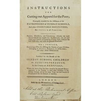Instructions for cutting out apparel for the poor. London: J. Walter [erased] [replaced in manuscript with] sold at the Parliament Office..., 1789. 8vo, 10 (of 13) folding plates, original boards with title in manuscript to upper cover