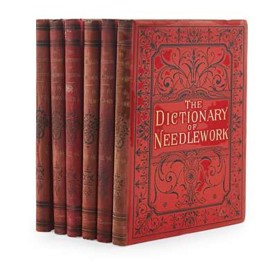 Illustrated catalogue of English embroidery. London: Burlington Fine Arts Club, 1905. Folio, original cloth; Barber, Mary. Some drawings of ancient embroidery. London: Henry Southeran, 1880. Folio, original cloth; De Dillmont, Therese. Encyclopaedia of needlework, [n.d.] 8vo, original cloth; Fryer, Jane Eayre. The Mary Frances sewing book… London: [n.d.]. 8vo, original cloth; Caulfield, S.F.A. and Saward, Blanche, C. The dictionary of needlework. London: A.W. Cowan, [n.d.] 6 volumes, second edition, 4to, original red cloth; and a large quantity of others (quantity)