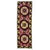 the purple field woven with three lemon and black rosette medallions, within lemon vine border