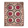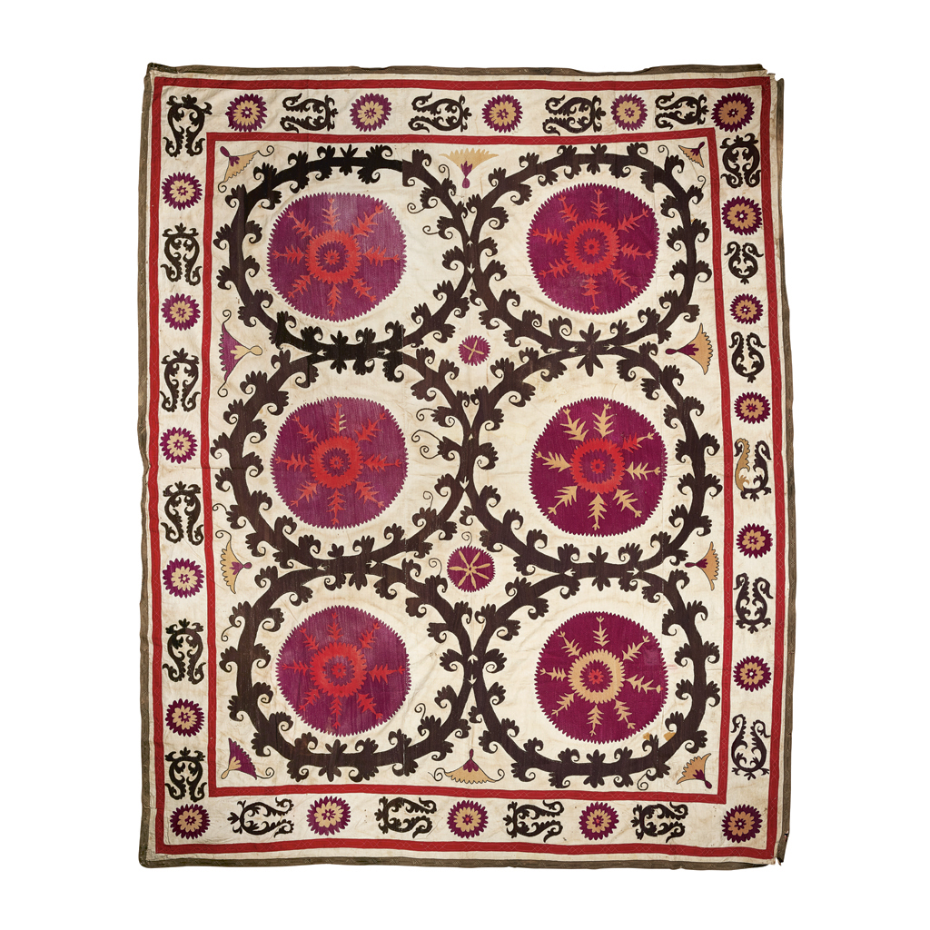 the cream field in three joined sections, woven with six purple rosette medallions and brown vine pattern, within cream rosette and foliate border