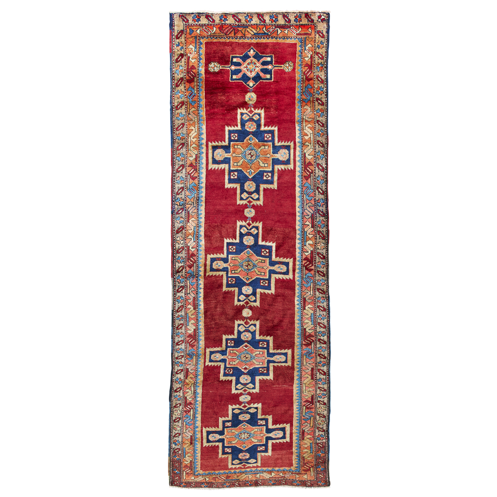 the plain red field with five indigo medallions, within pink and camel double border