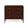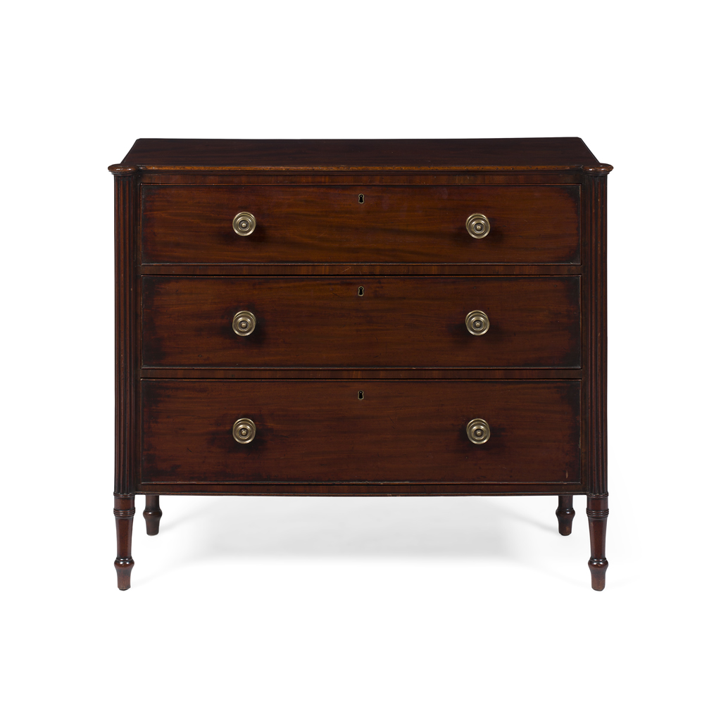 the rectangular top with rounded outset corners, over three long drawers flanked by reeded columns, raised on tall turned and tapered legs