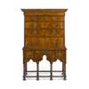 the moulded cornice above a cushion moulded frieze, over a pair of feather banded short drawers, a long drawer, a further pair of short and a final long drawer; the stand with a long drawer flanked by deep short drawers, over a shaped apron, raised on spiral carved legs joined by a wavy stretcher and ending on bun feet