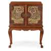 in the George II style, fitted as a drinks cabinet, the moulded caddy top above a pair of doors with stained and embossed leather panel doors, opening to an interior fitted with shelves, drawers, and a slide, raised on foliate carved cabriole legs ending in claw and ball feet; the leather panels signed 'F Horchman'(?), 'Mechelen 1948', and Malines. 1948'