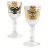 each with a bucket shaped bowl engraved with black and gilt details displaying the cypher of Nicholas II within a trophy of arms, and an Imperial crowned double-headed eagle to the reverse, above a cut and knopped stem raised on a conical foot, one with etched cypher and dated 1915 to the underside of the foot (2)