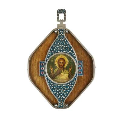the diamond shaped plain silver frame enclosing a central painted circular icon of Christ Pantocrator, against an elliptical opaque antique blue enamel ground enriched with silver filigree scrolls and set with small red gem panels, against a pale wood ground, with similarly decorated hinged suspension link, marked Fabergé with Imperial warrant, Moscow 1908-17, with scratched inventory number 38837