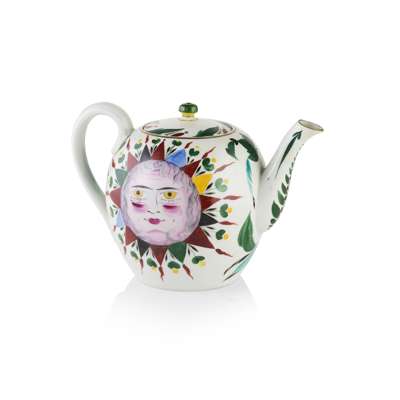 decorated in polychrome enamels, with an anthropomorphic sunflower head to one side and a stylised cockerel amongst flowers to the other, signed and dated to lid, body and underside