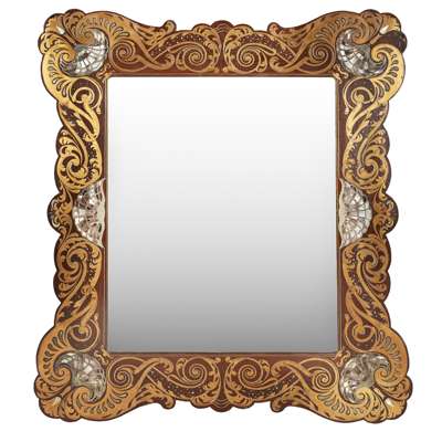 the rectangular bevelled mirror plate in a shaped frame inlaid with foliate scrolls and shell motifs
