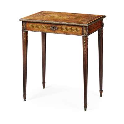 CONTINENTAL BURRWOOD, MAHOGANY, SATINWOOD AND FRUITWOOD MARQUETRY GILT METAL MOUNTED OCCASIONAL TABLE
