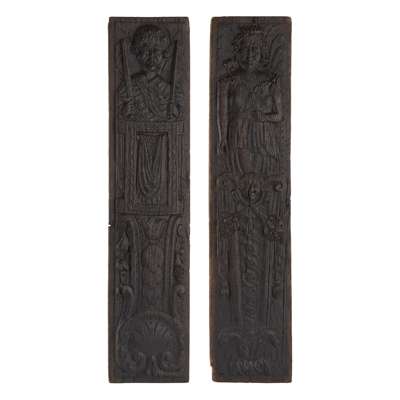 the rectangular panels carved in shallow relief, one with a figure of a woman wearing a crown, the other with a man with a sword and staff, the fields carved with acanthus, palms, fruit and masks (2)