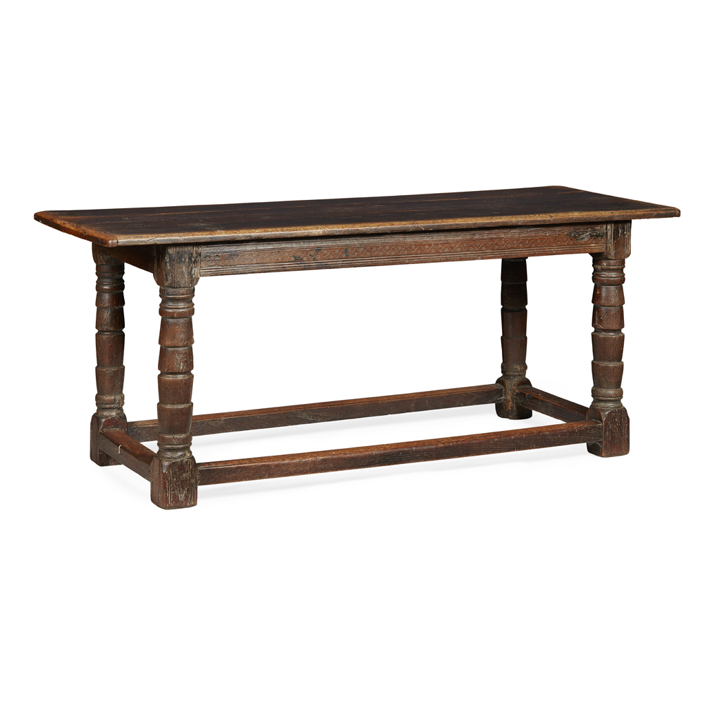 the rectangular three plank top with cleated ends, raised on turned legs, joined by peripheral stretchers
