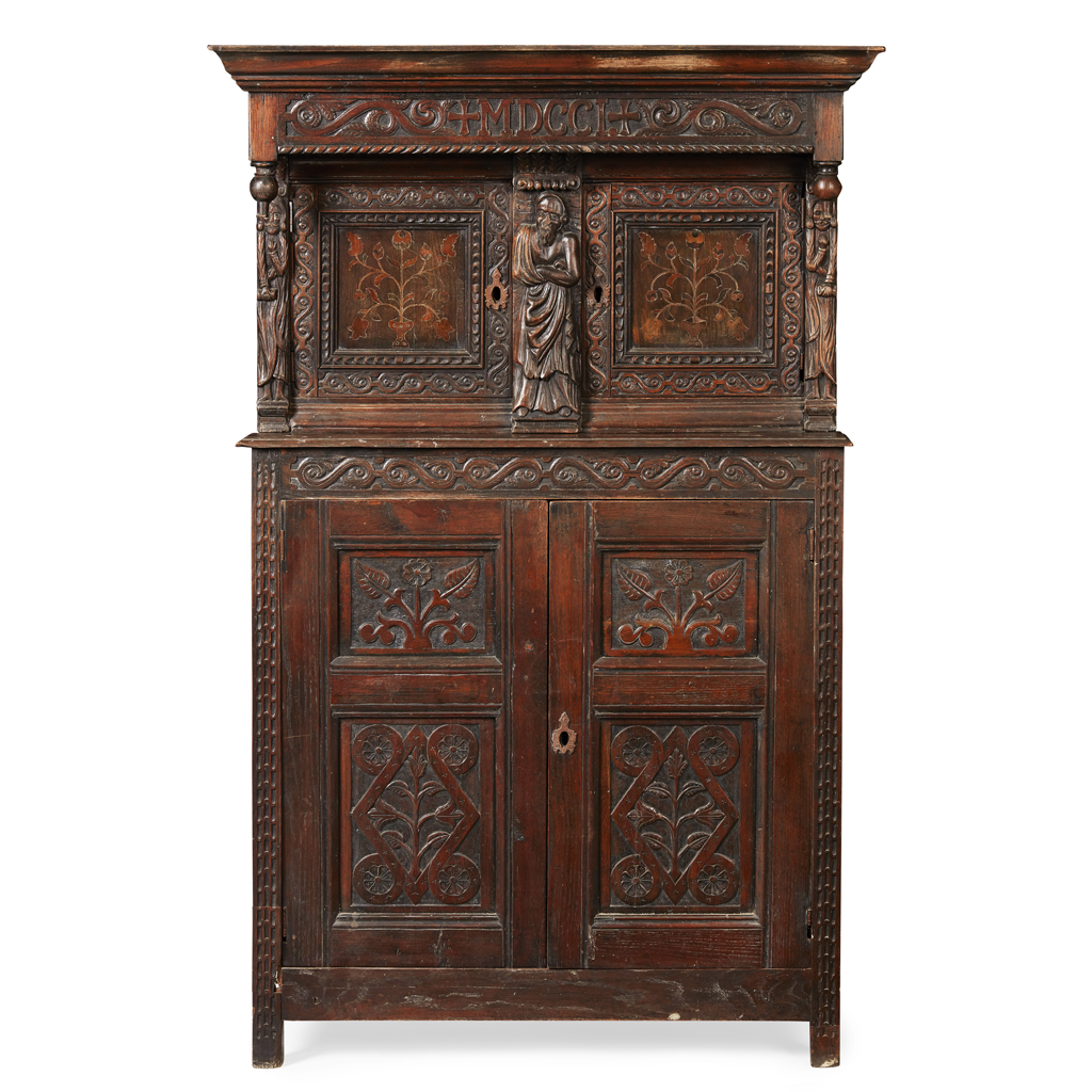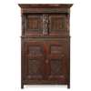 CARVED OAK AND MARQUETRY COURT CUPBOARD