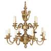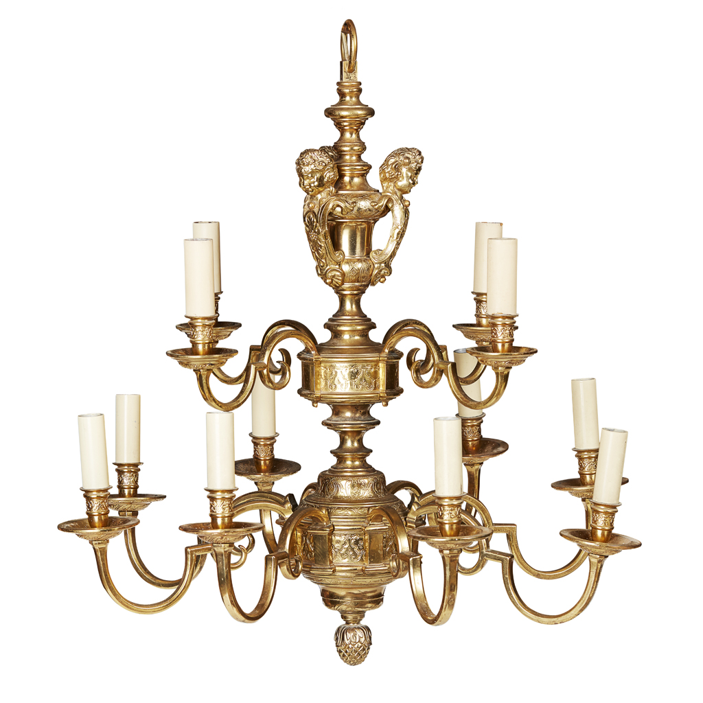 in the 17th century style, the turned central column with putti heads and strapwork, issuing twelve scrolled arms in two tiers, with a berry pendant finial, fitted for electricity
