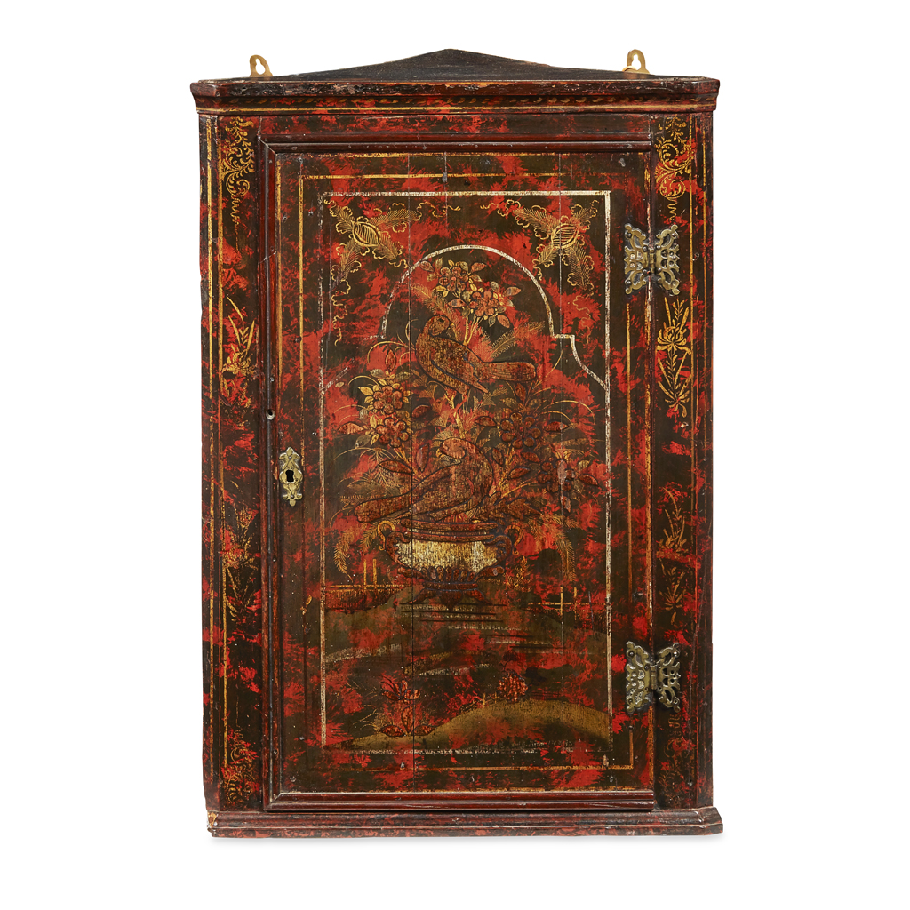 WILLIAM AND MARY JAPANNED AND GILT HANGING CORNER CUPBOARD