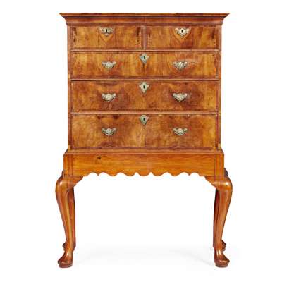 the moulded cornice above a pair of short drawers and three long graduated drawers with crossbanding; the later stand with a shaped apron and raised on cabriole legs ending in raised pad feet